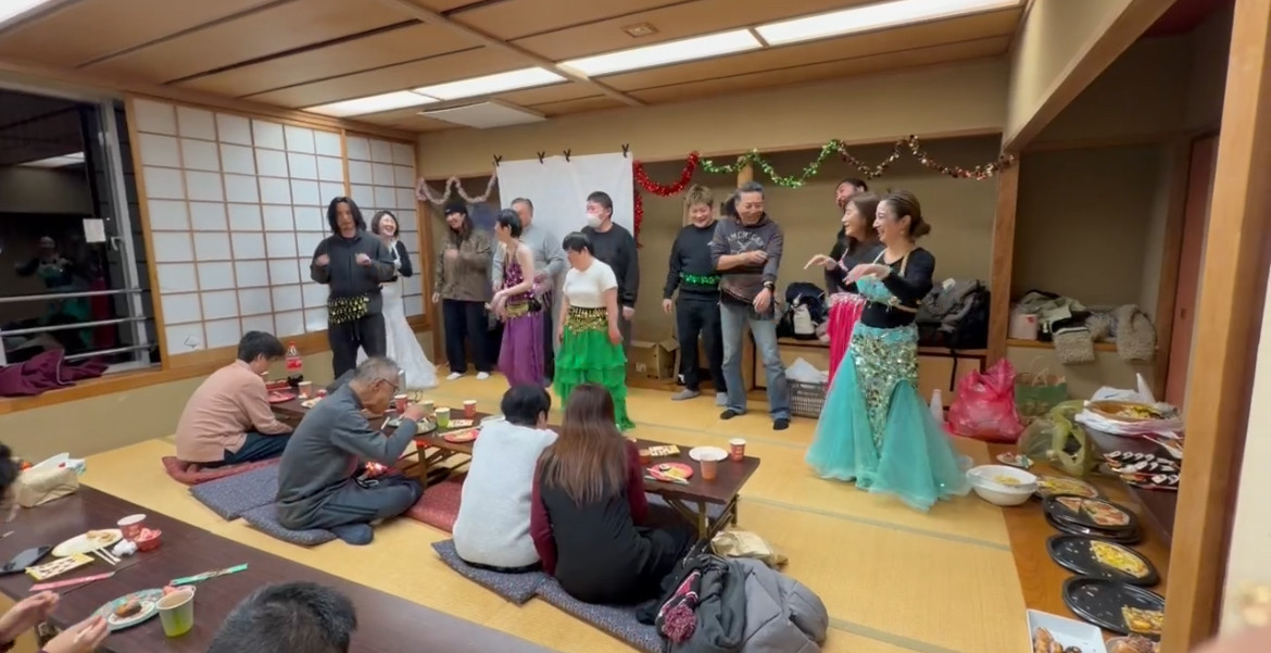 職員とらぱんっ子のYさんとAさんでベリーダンス、クリスマスソングで踊ってみました!トリを飾った管理者の早坂さんのベリーダンスを観たらぱんっ子達は、目をキラキラしながら観ていました!
